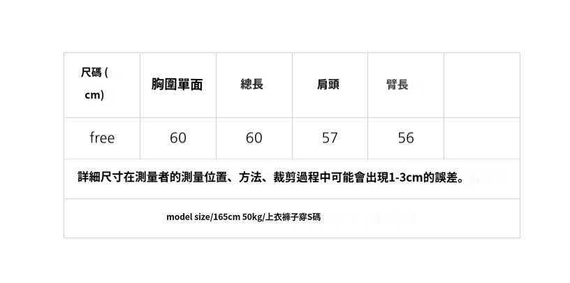 | 尺碼(cm)free 胸圍單面 60 總長 60 肩頭57 臂長56 |