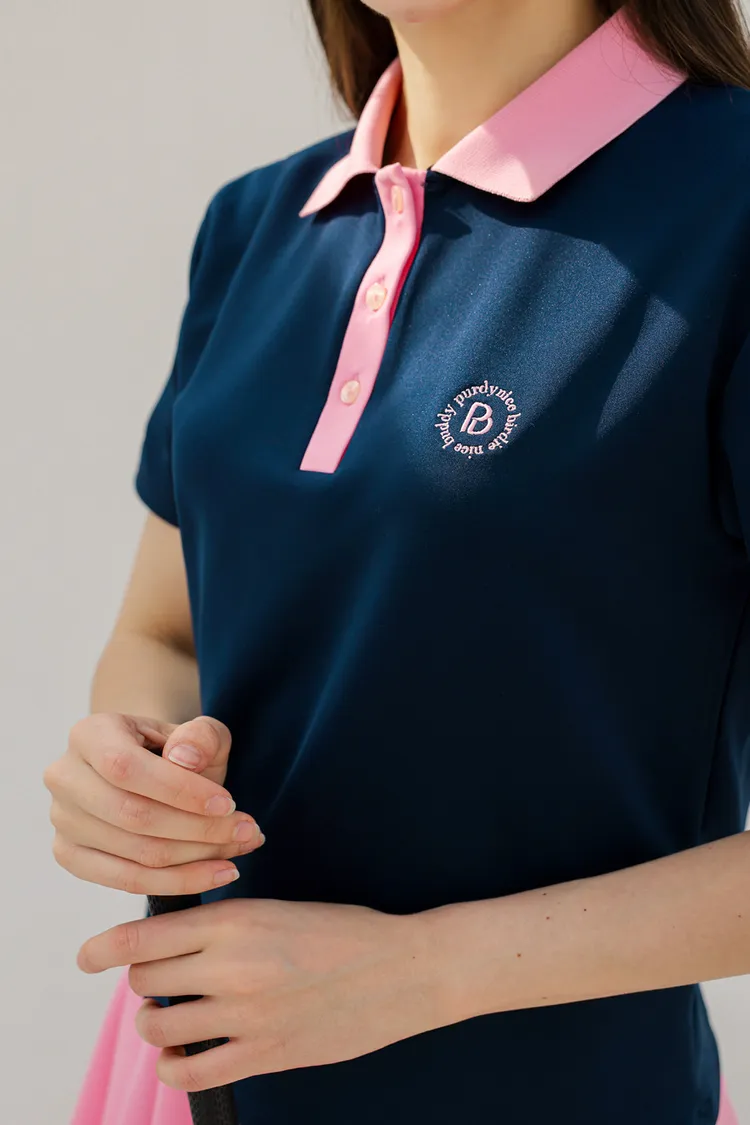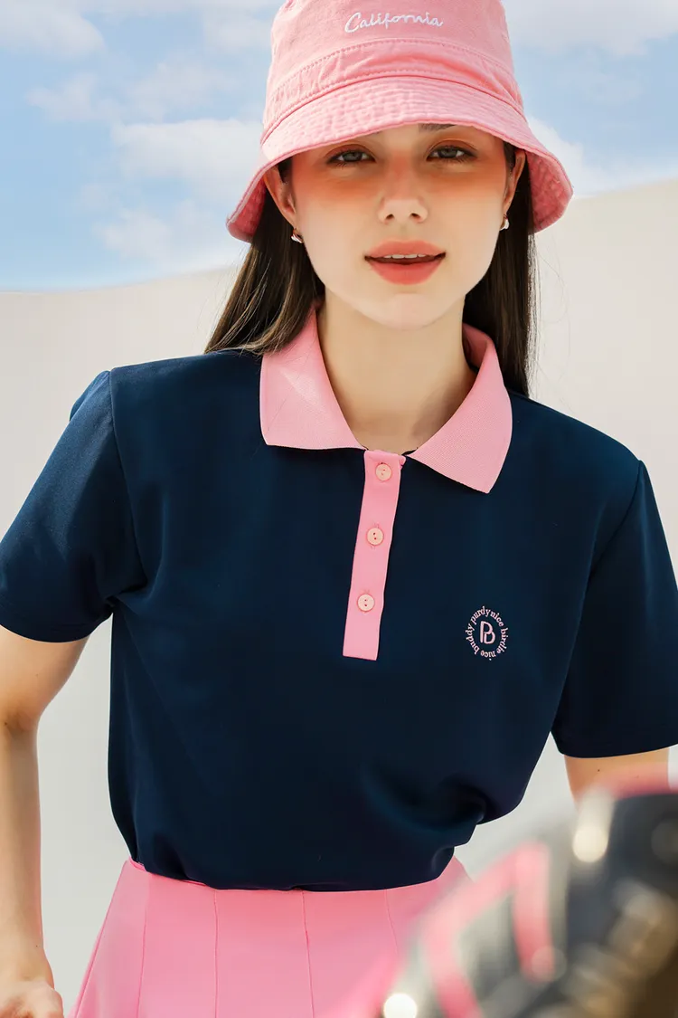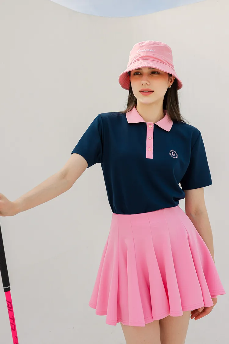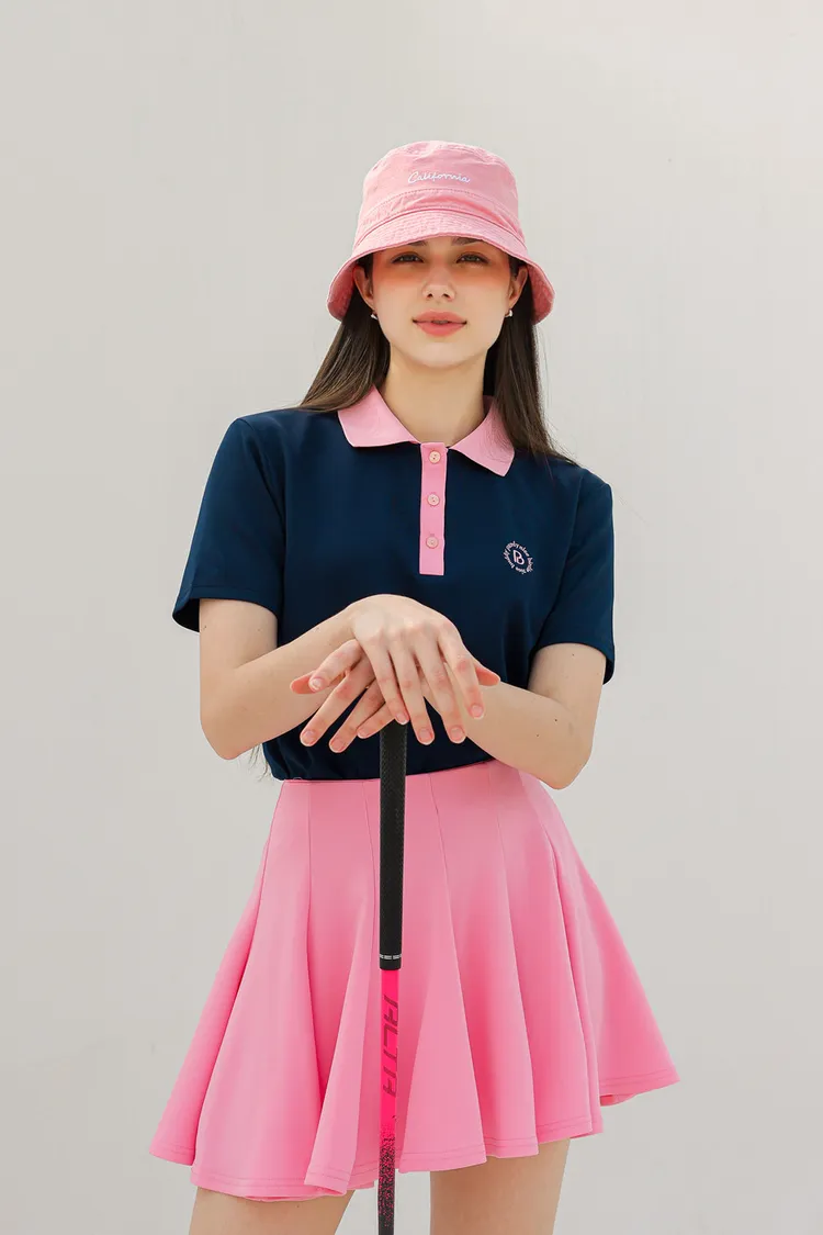 粉嫩花苞裙搭配撞色POLO上衣,展現俏麗與活力。