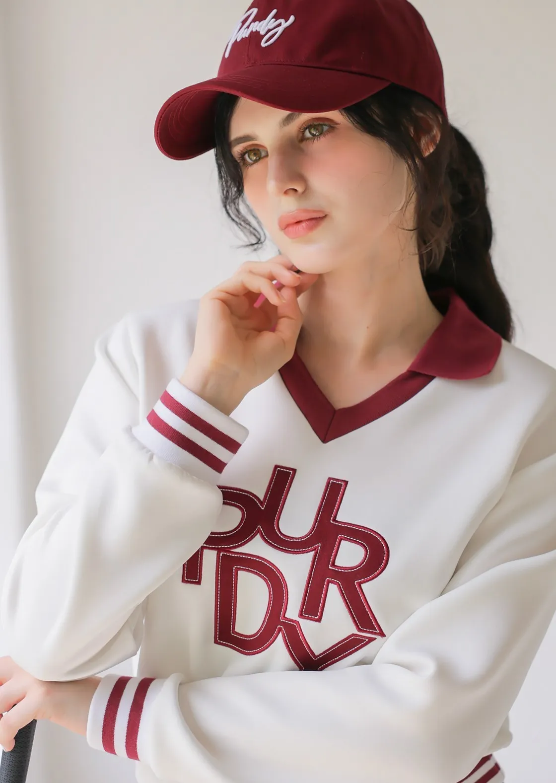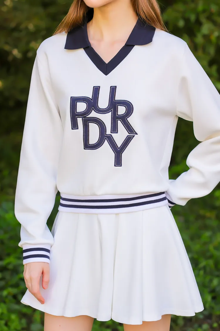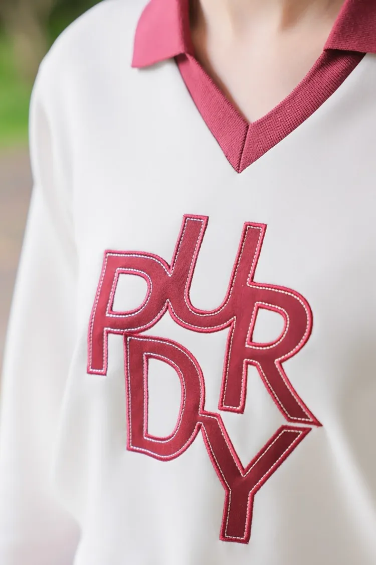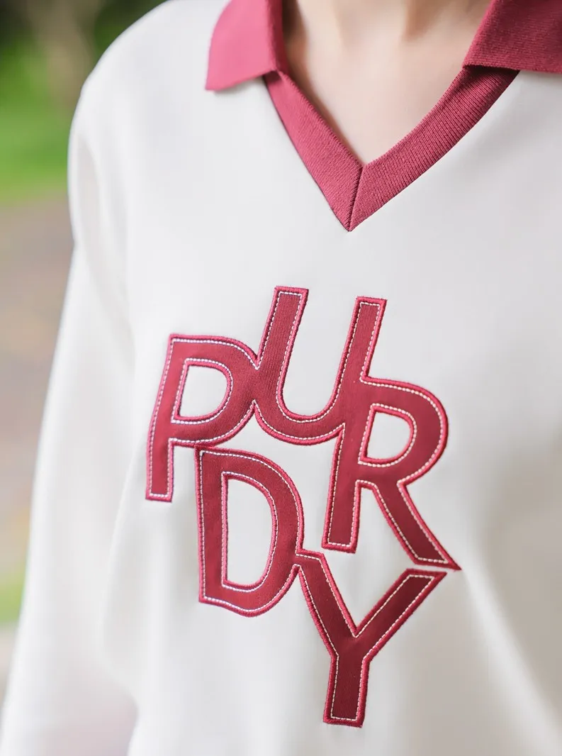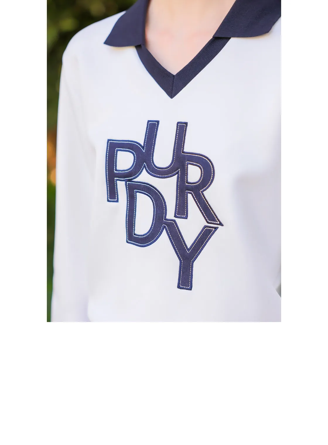 前胸大面積 Purdy 字母刺繡 充滿視覺張力,領口與袖口撞色設計更顯立體,