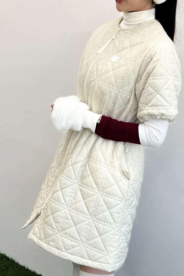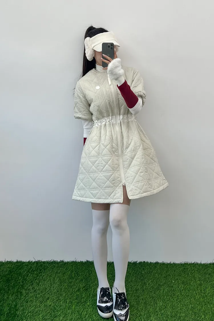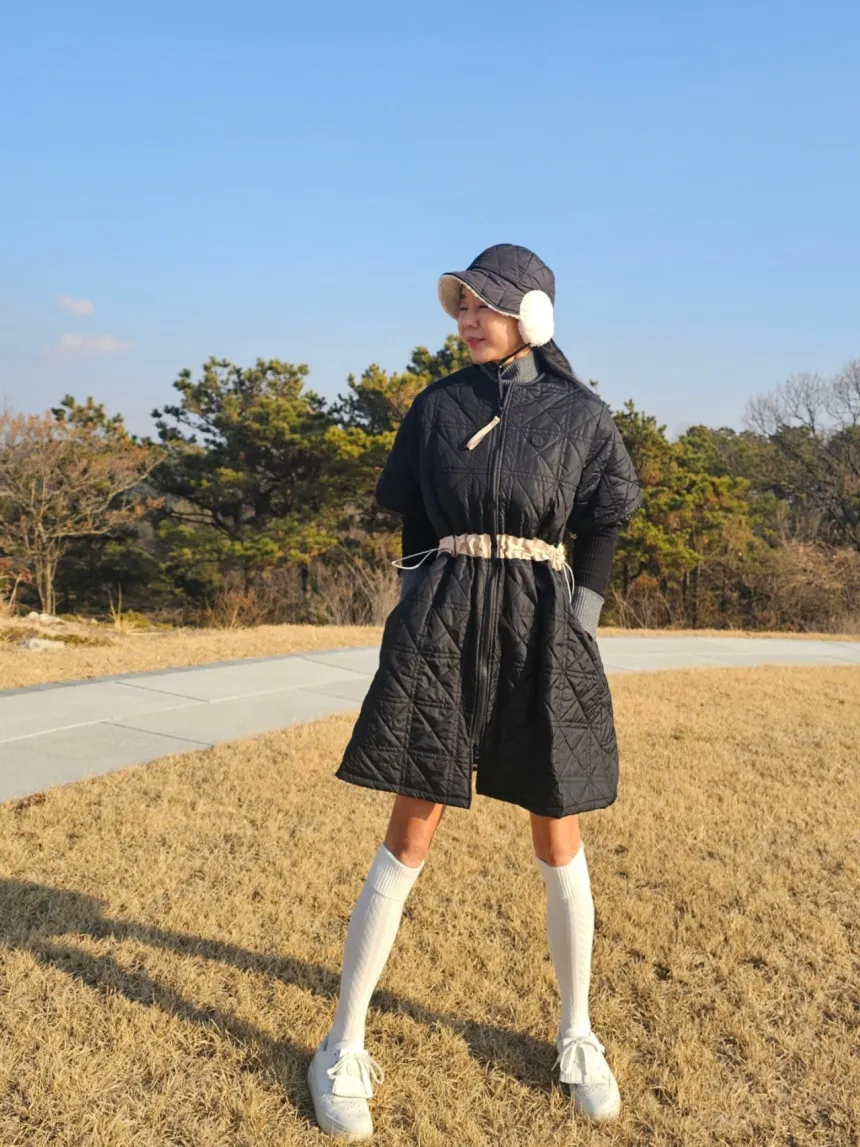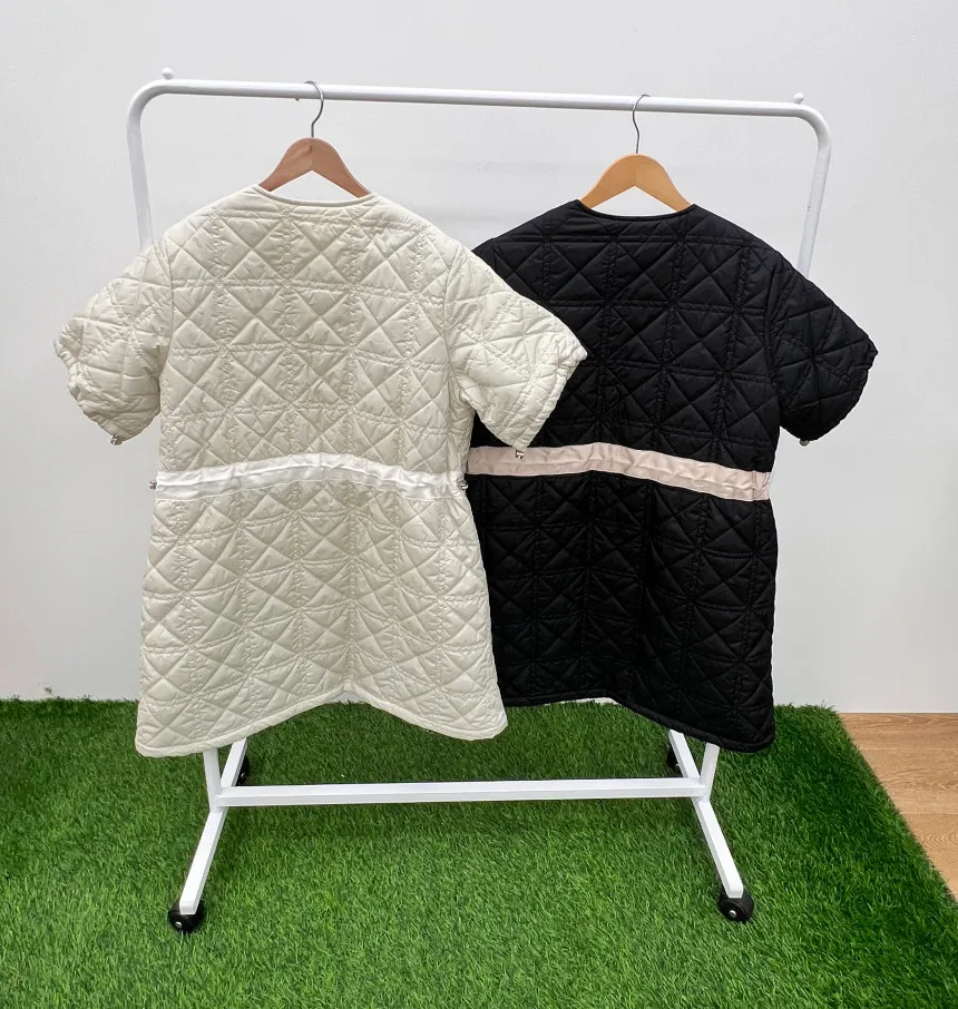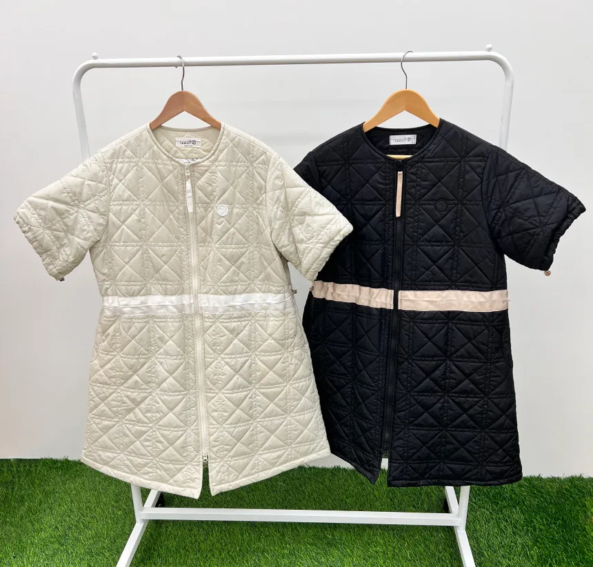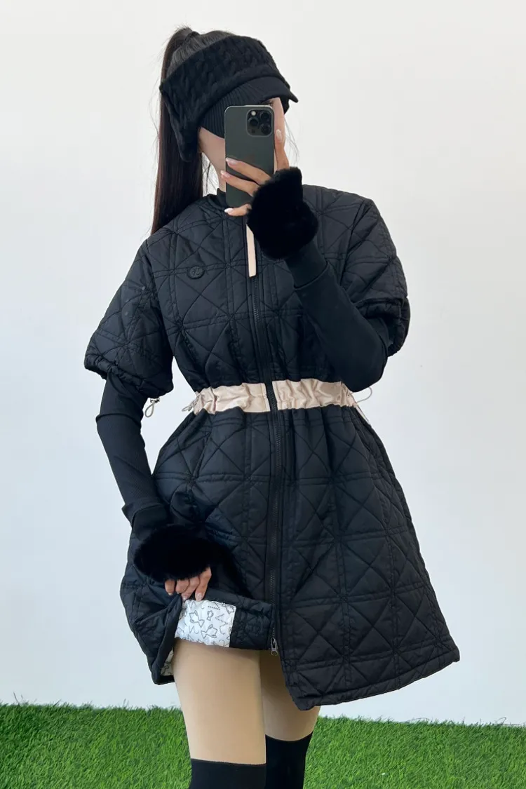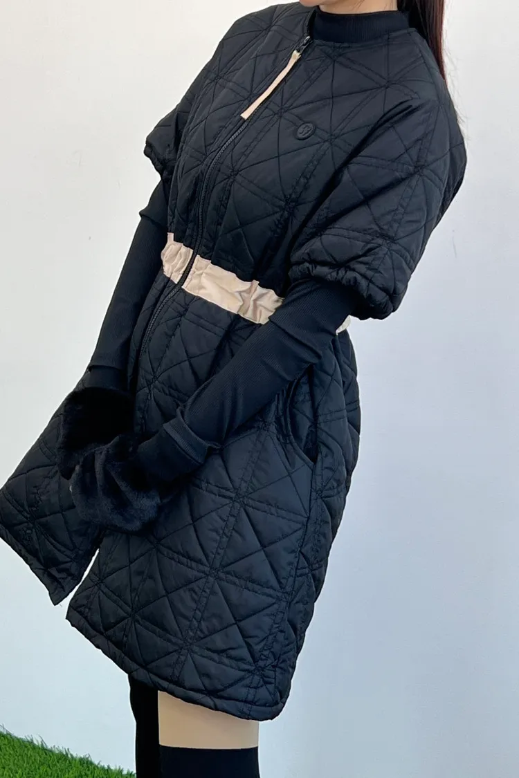 以立體菱格鋪棉展現溫柔曲線,長版剪裁搭配可調節收腰設計,